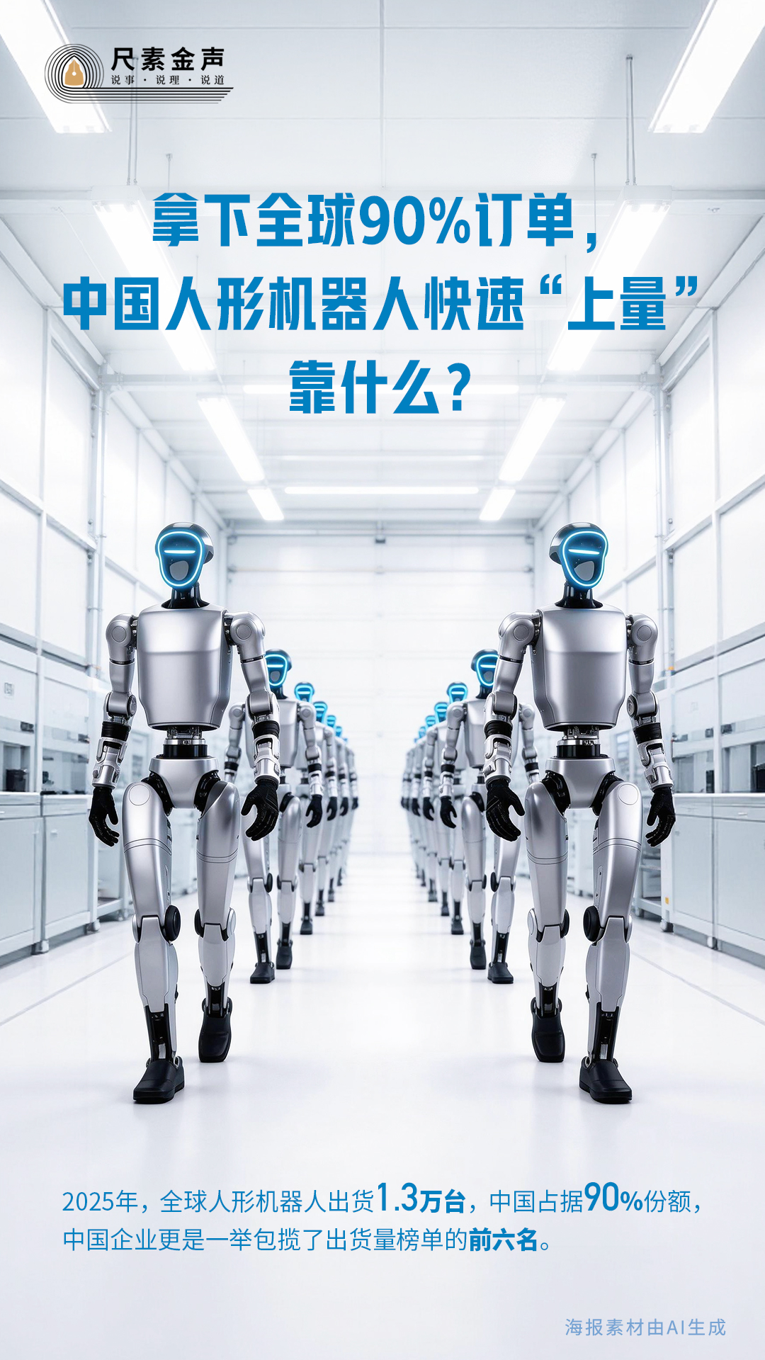 出货量,常用在手机等消费电子领域,指的是生产商在一定时期内将产品发送给代理商或中间商的数量。虽然不能直接等同于最终销售的数量,但也被视为衡量生产和市场供应情况的重要指标。对于人形机器人这样一个方兴未艾的产业来说,中国产品能够快速“上量”,从实验室走向规模化量产,并拿下全球90%订单,既具标志性意义,也成为观察中国人形机器人产业发展的一个窗口。
