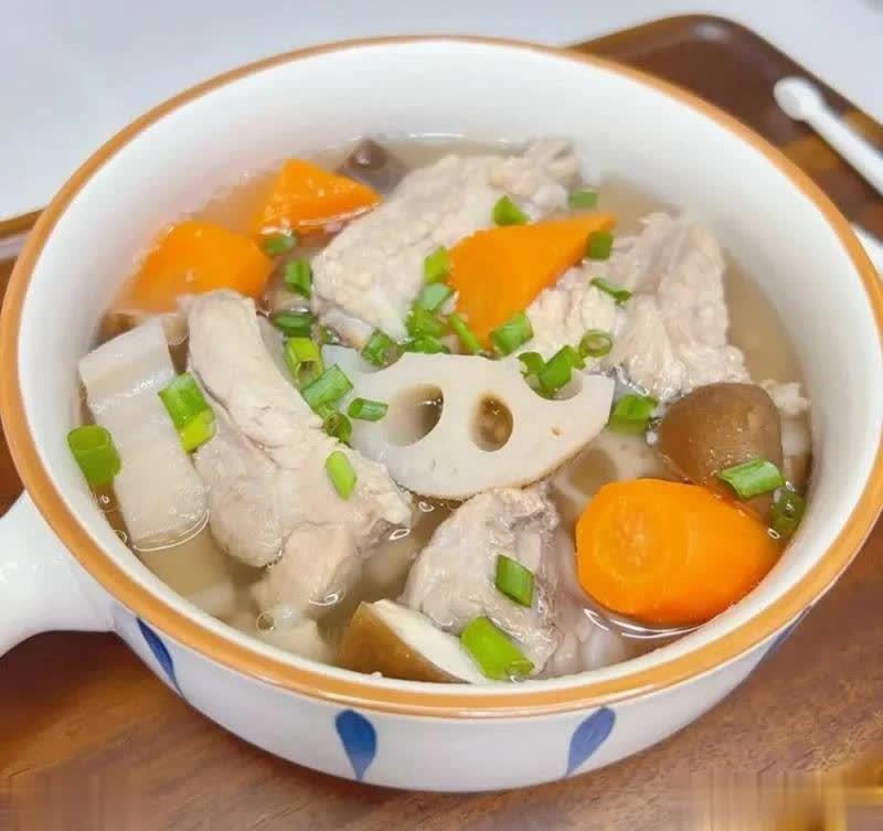 3、将莲藕、焯过水的排骨、生姜片一起放入锅中,加足量清水,大火煮开后,转小火炖1个小时,出锅前加适量食盐调味即可,还可以在表面撒点葱花做点缀。